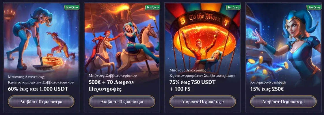- Weekly Crypto Reload. 60% μπόνους έως 1000 USDT για εκείνους που προτιμούν τις καταθέσεις σε κρυπτονόμισμα.